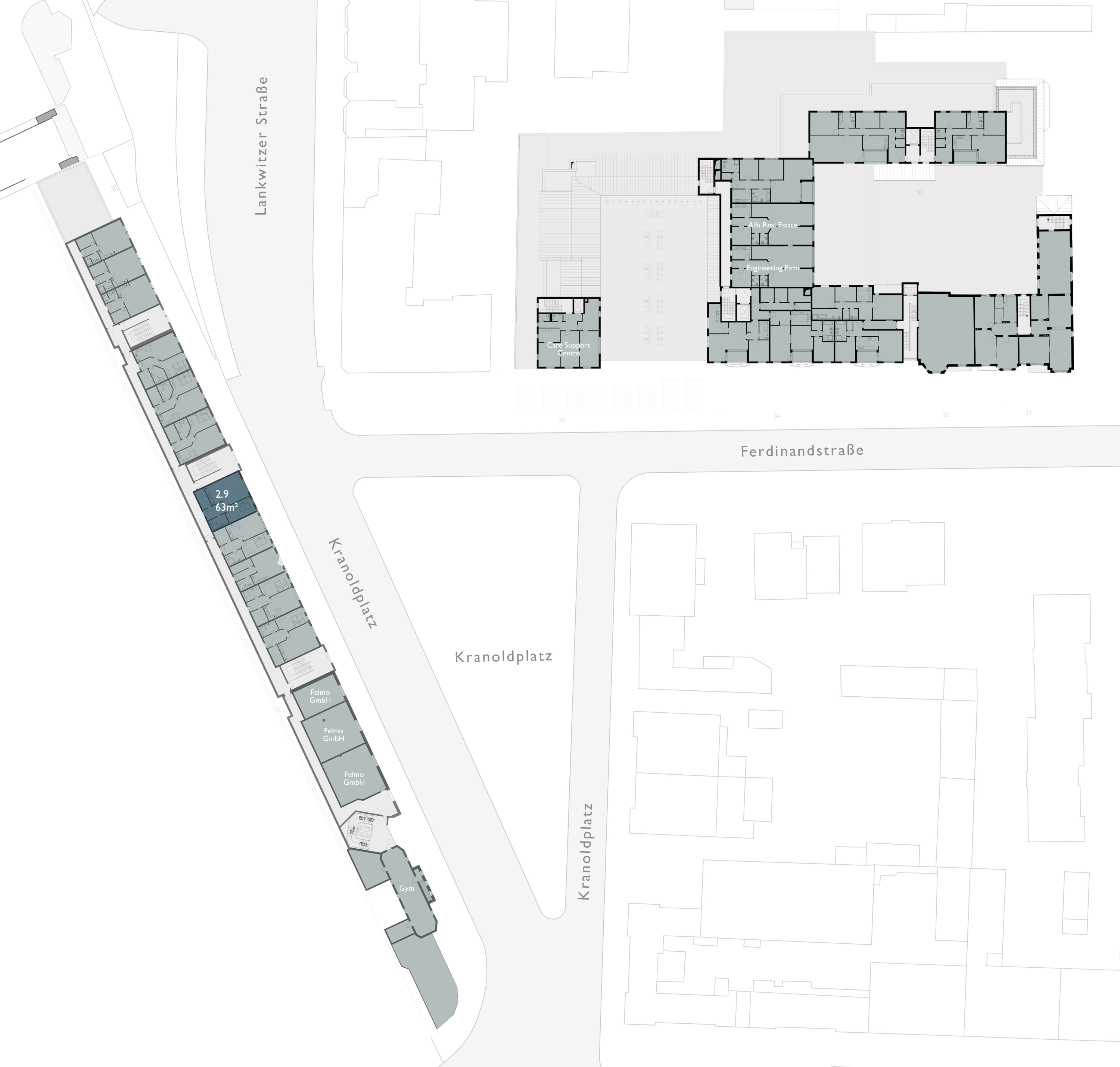 Note: Rental space plans are created exclusively for coordination with tenants and are not execution planning. All details are subject to structural engineering, building services, surveying, fire protection reports, soil surveys and official authorisation. Letting concept, not binding. Tenant names and other details stated on the planning documents are non-binding.
